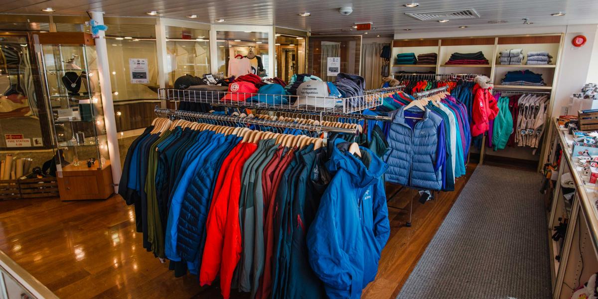 If you forgot any essentials or need a little souvenir from your voyage, the Polar Boutique on the Main Deck is our onboard gift shop. Opening hours will vary based on the daily expedition activities. Gifts and souvenirs are great to bring home as mementos of your polar expedition. In addition to small souvenirs, our Polar Boutique offers a selection of expedition gear, including base layer clothing, waterproof pants, gloves and more.