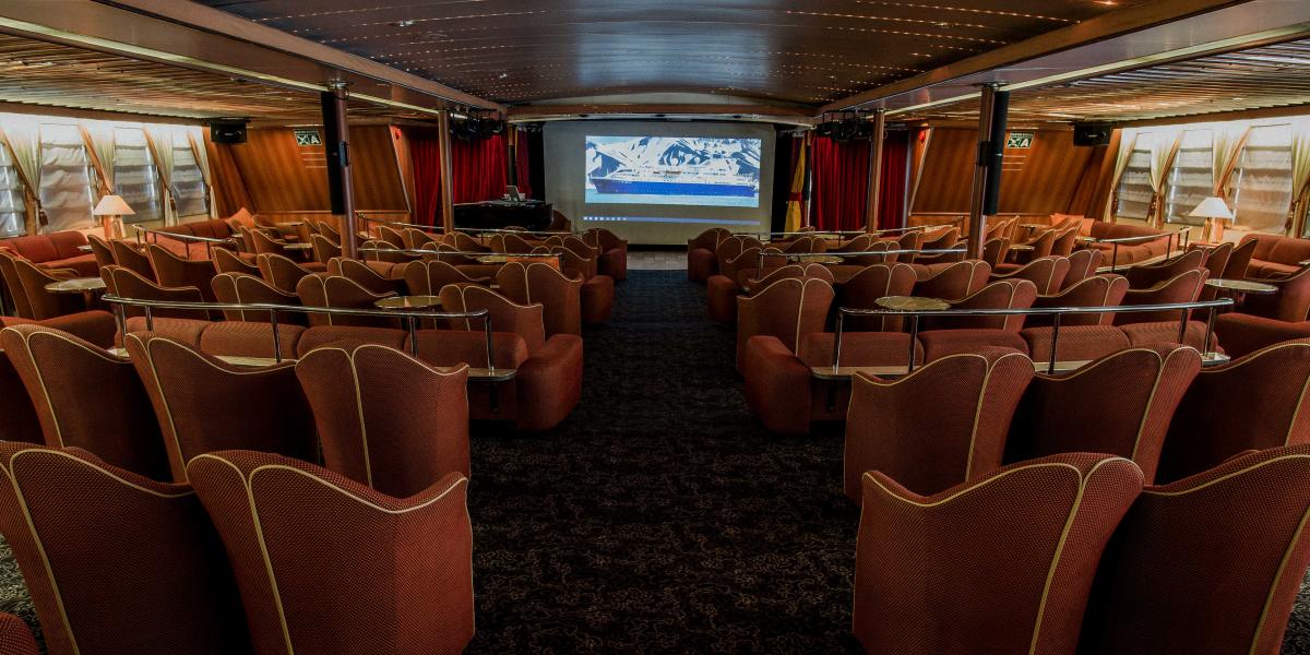 Our theater-style auditorium in the Main Lounge on the Upper Deck can easily accommodate everyone onboard, so it servesas our main lecture hall where presentations and movies are provided for your education and enjoyment. The Lecture Theater is open 24 hours a day